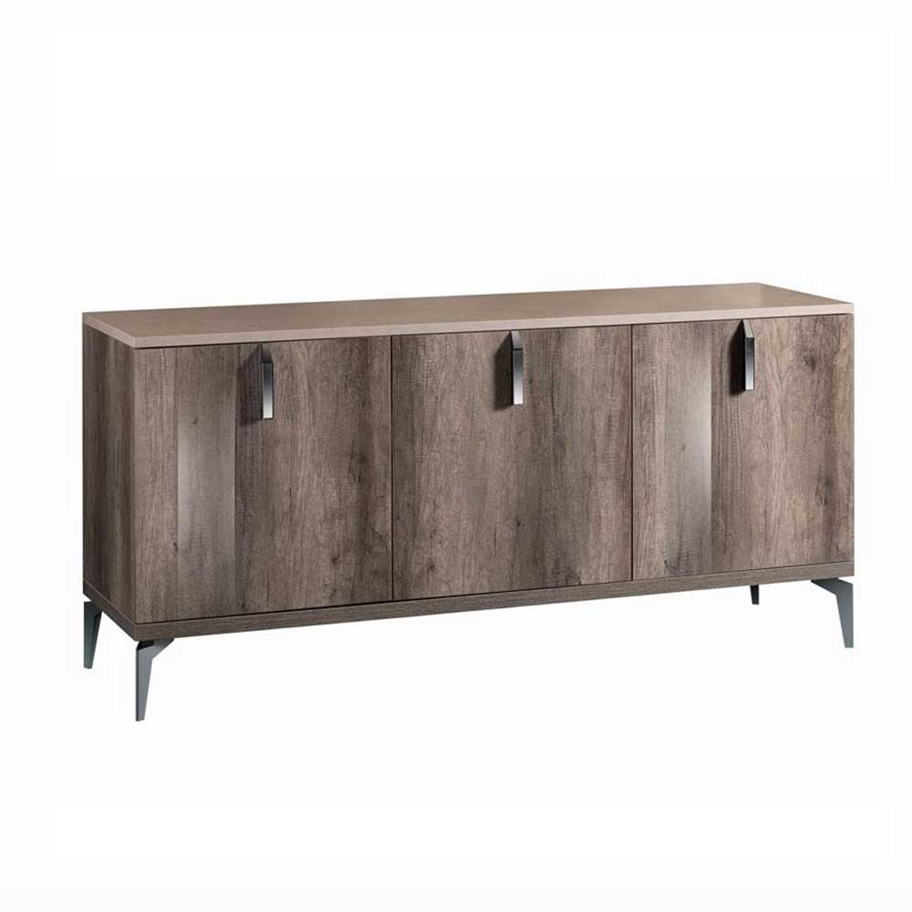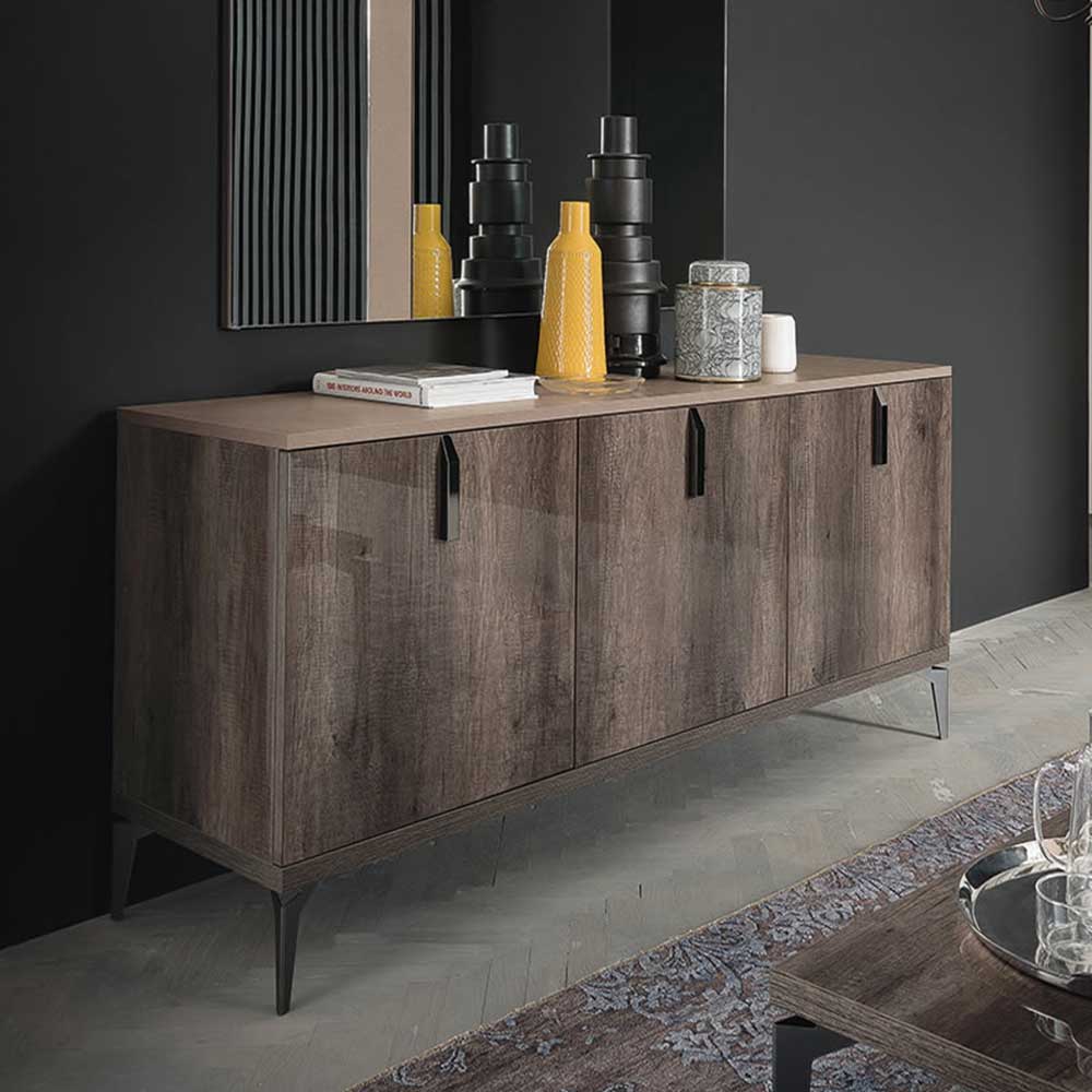 The Alf Italia Matera 3 door sideboard features the doors in Rim Surface Oak which is followed by Mirrored metal accents on the handles and feet.