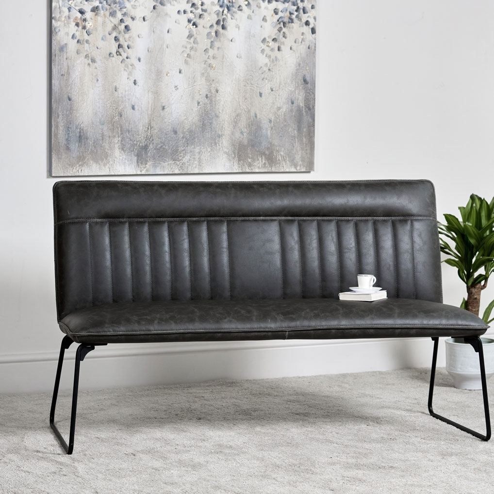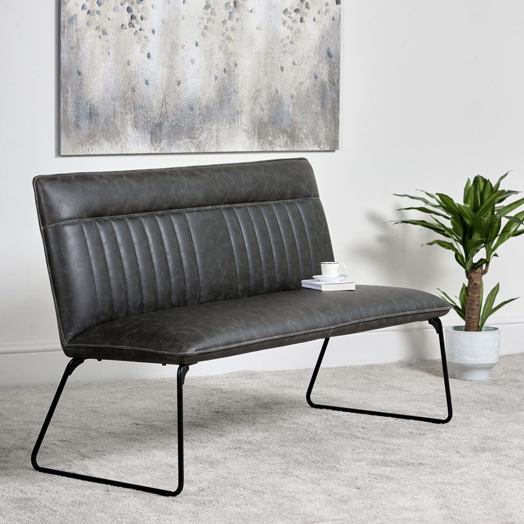 The grey rustic finished faux leather will add a industrial style look in your dining room. Pair this bench with the Islington pedestal dining table and Cooper dining chairs for a stylish look.
