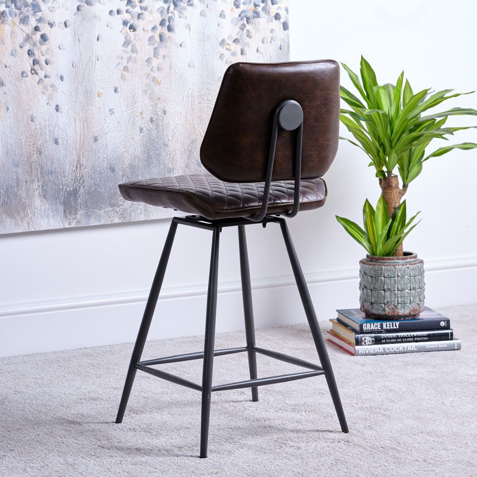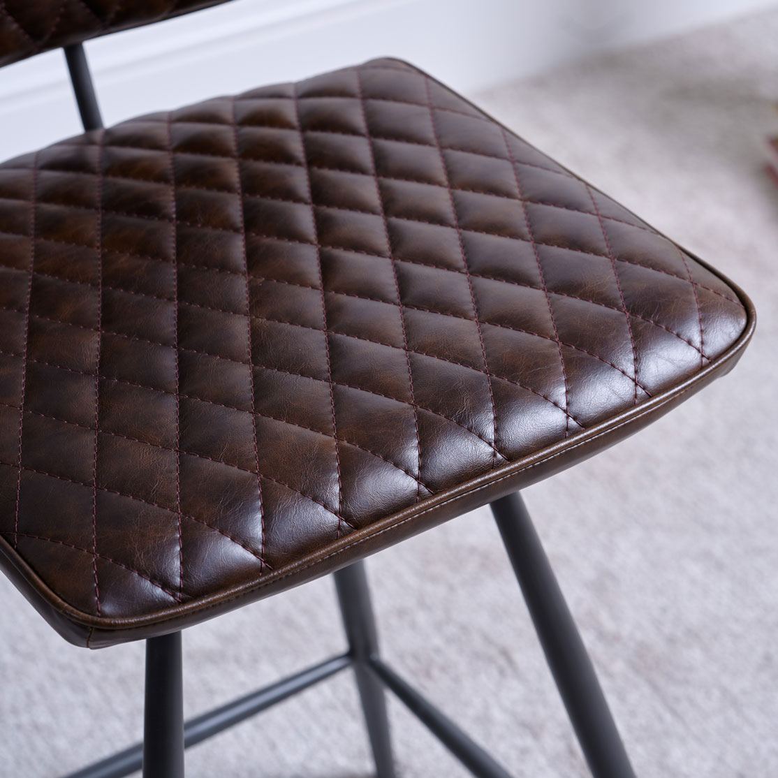 This chair is upholstered in a stunning leather with a diamond quilted backrest and seat. You can also create an edgy look by pairing the blue and brown leather together on different chairs.
