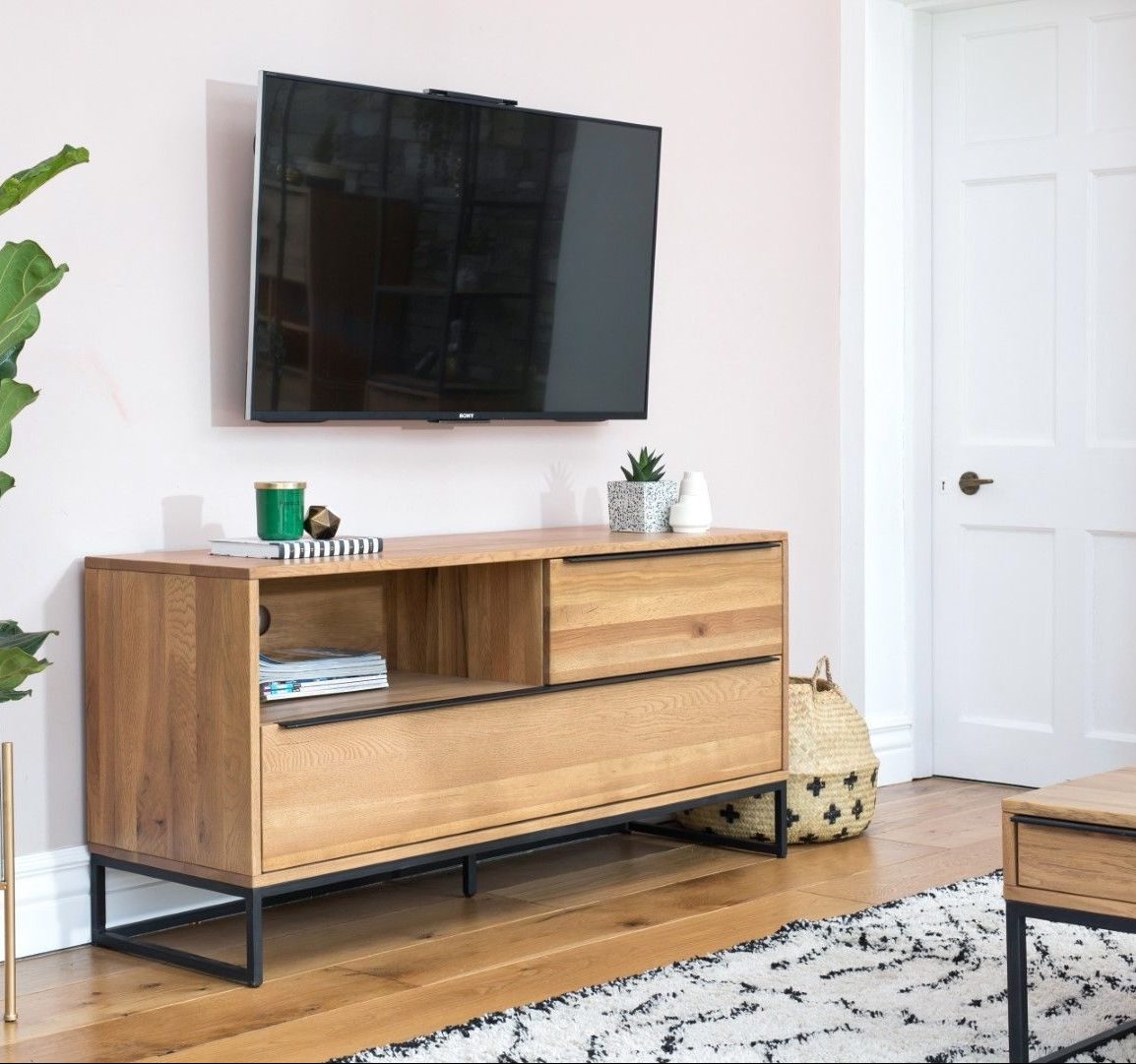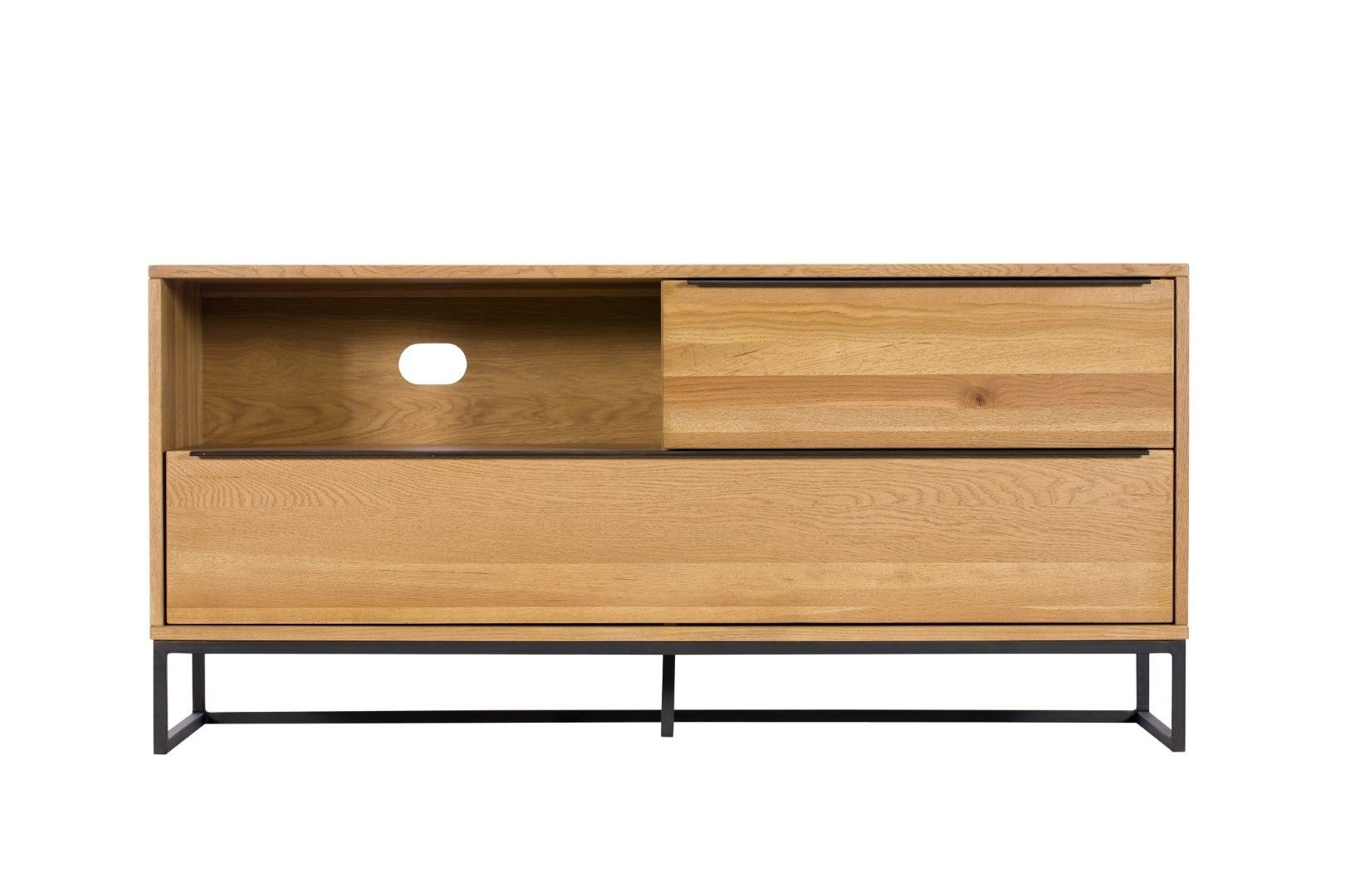 This TV unit features a solid oak frame with 2 drawers which both feature a slim black metal handle. Accompanying the solid oak frame is a sleek black metal base which add a modern touch to this unit.
