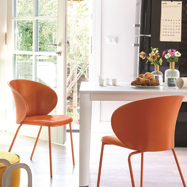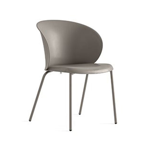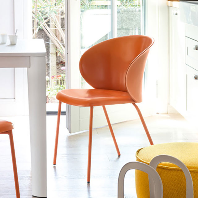 The striking Tuka Chair features a statement bold C-shaped back and seat moulded in sleek recycled polypropylene material, and is available in stacking and non-stacking styles. The seat is supported by slender lacquered metal legs, which can be selected in a range of finishes.