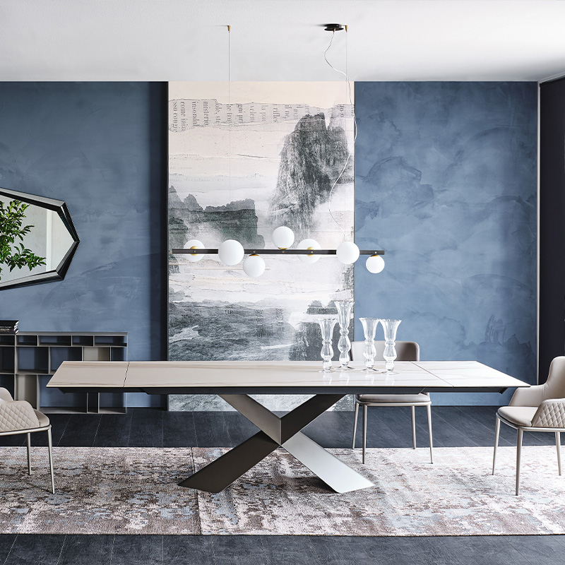 Tyron is the family of design tables, conceived by Paolo Cattelan, which inaugurates a new vision of the modern living area. The plays of styles between the iconic base and the customisable table top makes each version an extraordinary piece of contemporary design. For those devoted to conviviality, even in limited spaces, there are two extendable Drive versions available: one for the refined glass top, with decorative CrystalArt print in different colours, and the other for the Marmi Ceramic top, in several exclusive shades, to make each environment remarkable. The collection is completed by the Signature model, hand-decorated by an artisan collective. Each table is unique and irreplicable, just like a work of art.