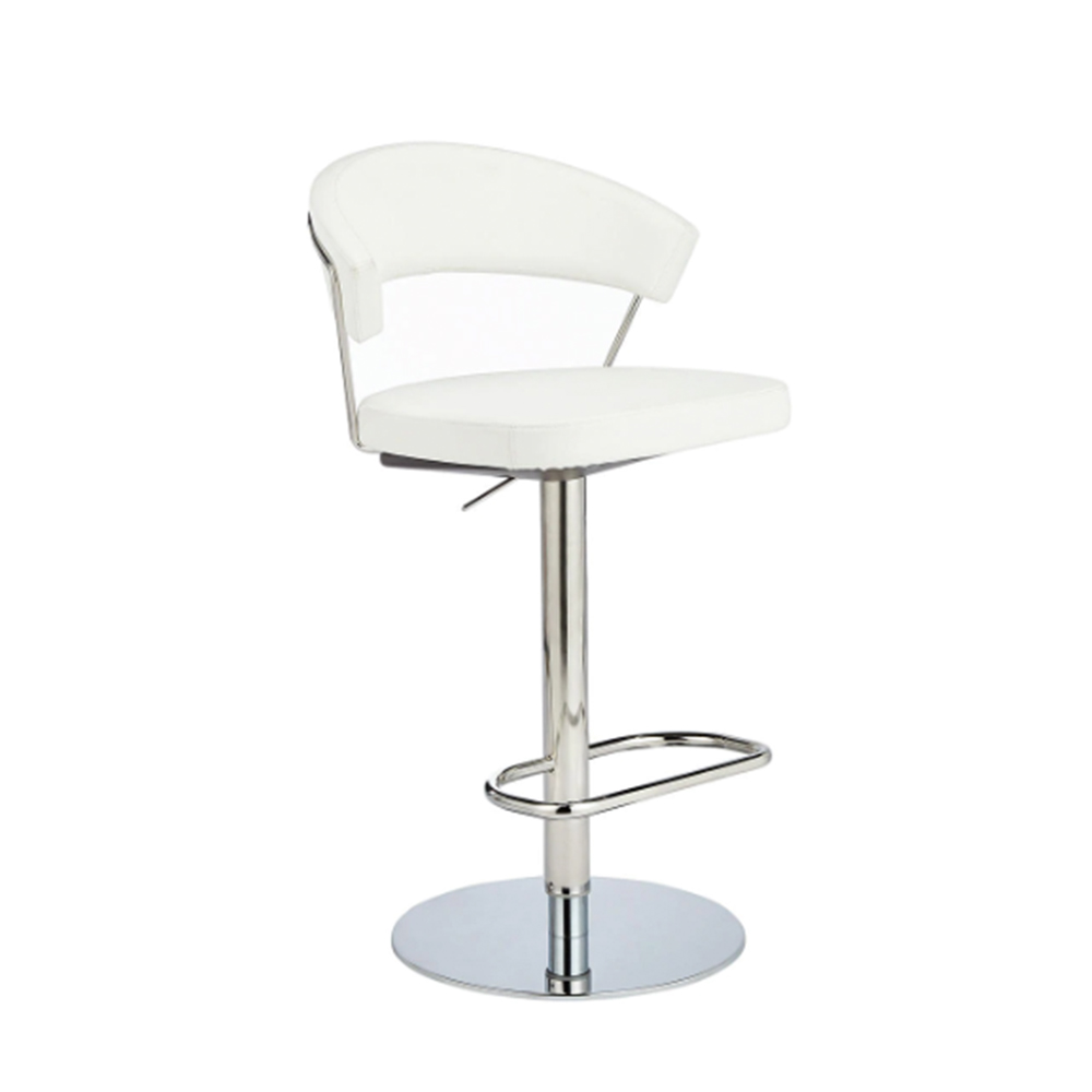 The NEW YORK stool has a metal frame and upholstered and covered seat/backrest. Height-adjustable swivel stool. Chrome-plated footrest.