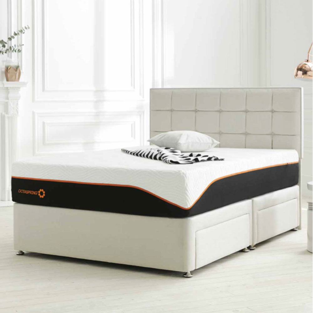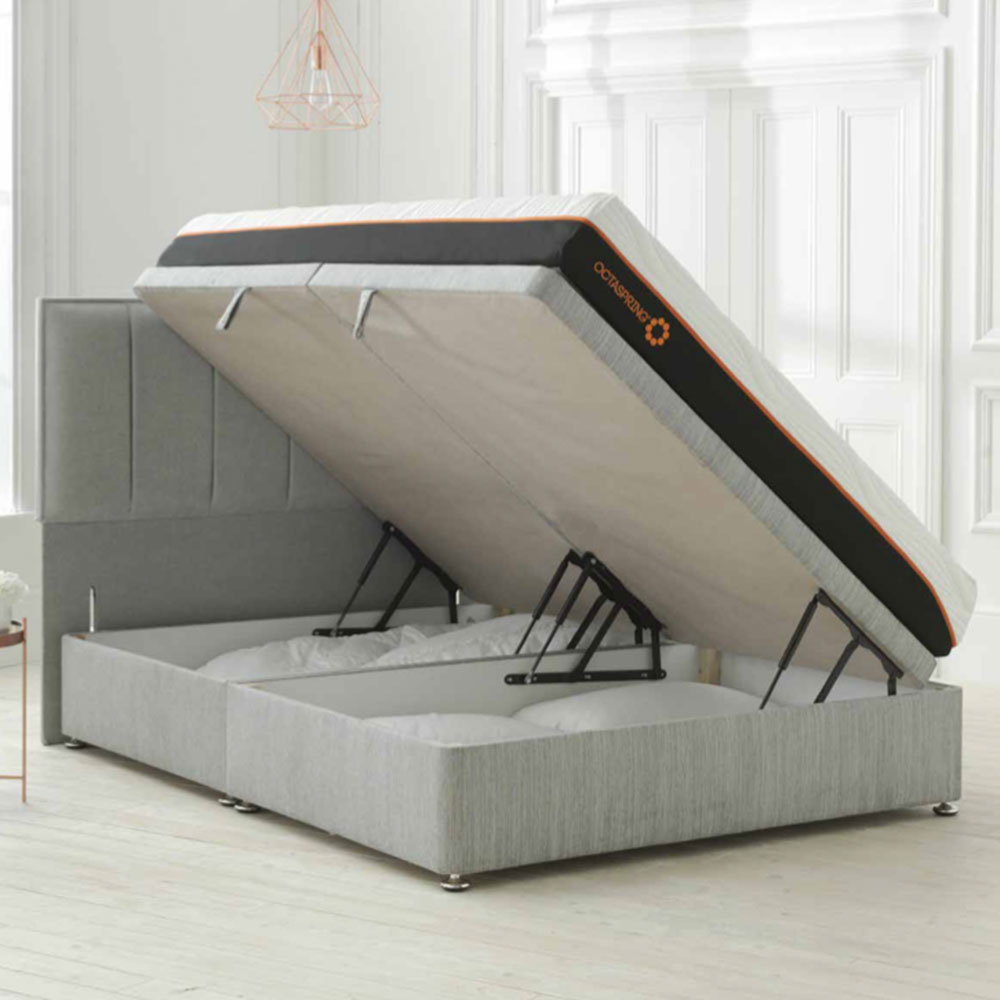 Elegance comes in simple things, like this Tiffany divan bed set, that features the fully opening Tiffany Ottoman base – the ideal solution for maximising your bedroom storage. This set comes with the The Octaspring 8000 mattress which is made of three deep layers of the unique Octaspring foam springs. Experience extraordinary ventilation that keeps you cool and fresh all night long, while delivering outstanding comfort and cradling memory foam support for your body. You will get comfortable quicker, fall asleep faster, spend more time in deep sleep and wake up feeling refreshed. Thats what sleeping on the next generation mattress means. Thats the difference Octaspring makes.