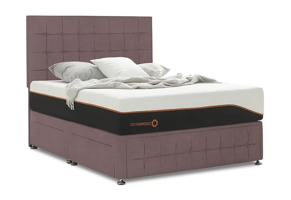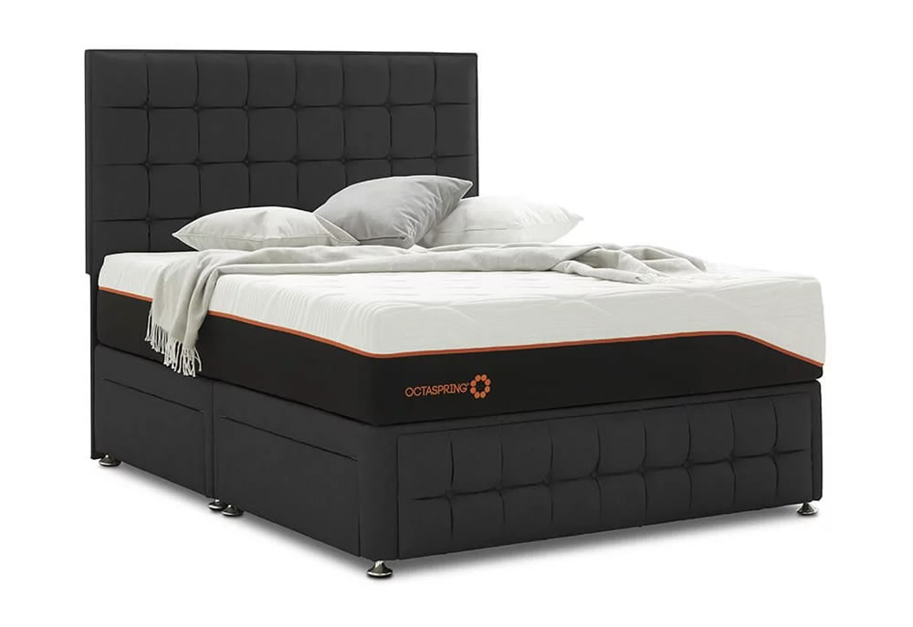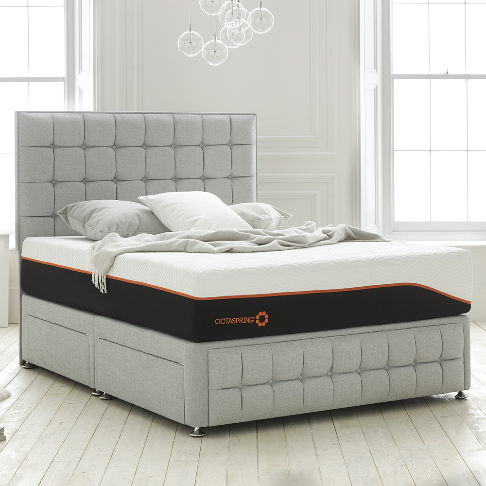 The gorgeous, opulently cushioned Venice divan base and headboard set will transform your bedroom and comes with the luxurious Octaspring HYBRID mattress. The new Octaspring HYBRID mattress is a perfect way to experience unique Octaspring technology, combined with the conventional feel of pocket springs. A perfect hybrid of modern and traditional – cradling comfort of breathable memory foam Octaspring springs, with the even weight distribution and great support offered by a layer of traditional pocket springs – a really great feel with medium firm support – truly the best of both worlds.