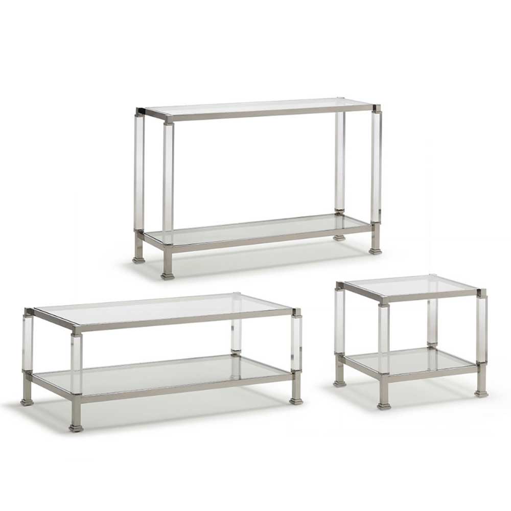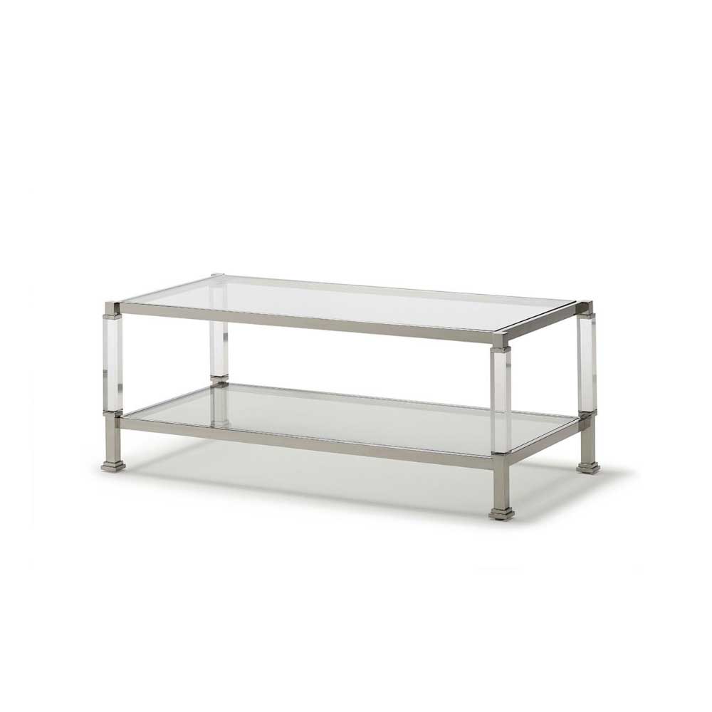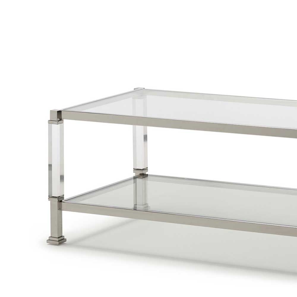 This coffee table features 2 glass shelves which are accompanied by elegantly shaped clear legs and is followed by polished steel accents. This coffee table is perfect for someone wanting a more modern and sophisticated look in their home.