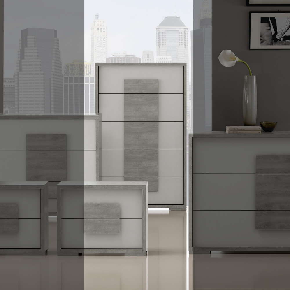 Lia 5 Drawer Chest has a contemporary design that will suit any modern bedroom setting. Crafted using silver ash wood finish on their front faces and sides, and the metallic trim on their top surfaces and vertical handle arranged in a single column this drawer chest will make an elegant centerpiece to any bedroom.